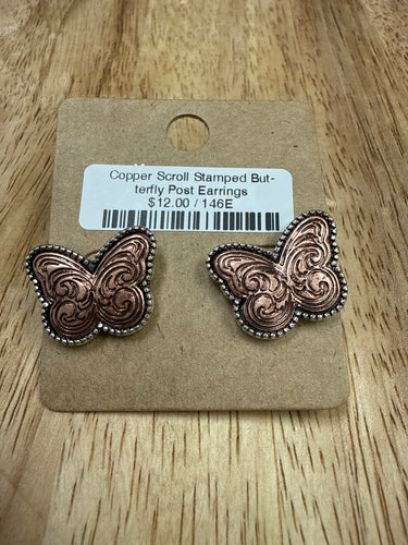 Sold outCopper Scroll Stamped Butterfly Post Earrings- Regular price